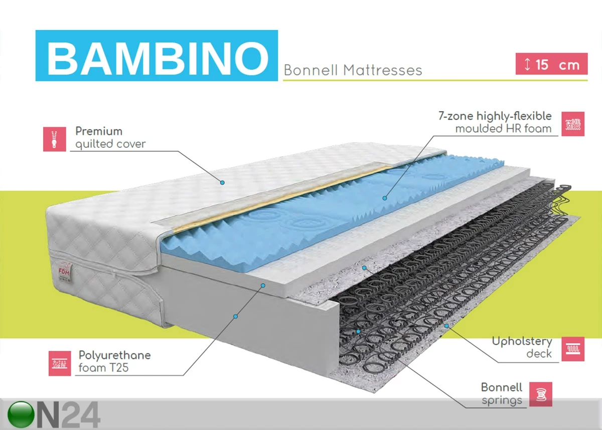 Patjan sisältö on profiloitua HR-vaahtomuovia (2cm), vaahtomuovia T25 (2cm), Bonnell-jousitus (10cm) • yksipuolinen patja, pehmeys H3 (keskipehmeä) • verhoiltu vaalealla strech -kankaallaPatjan sisältö on profiloitua HR-vaahtomuovia (2cm), vaahtomuovia T25 (2cm), Bonnell-jousitus (10cm)•yksipuolinen patja, pehmeys H3 (keskipehmeä)•verhoiltu vaalealla strech -kankaalla•päällinen on antiallerginen, tikattu joustokangas (100% polyesteri)•päällinen on vetoketjulla avattava ja pestävissä enintään 30 ºC vedellä•Käyttöajan pidentämiseksi suosittelemme petauspatjan käyttöä