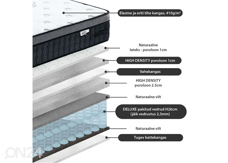 luonnollista lateksia sisältävässä, laadukkaassa joustinpatjassa on jäykempi jousitus, joustinpatjan korkeus on 30 cm • Pakattu deluxe-pocket jousitus ( 2.3 mm/jäykkyys)luonnollista lateksia sisältävässä, laadukkaassa joustinpatjassa on jäykempi jousitus, joustinpatjan korkeus on 30 cm•Pakattu deluxe-pocket jousitus ( 2.3 mm/jäykkyys)•Kevyt, joustava patjanpäällinen on valmistettu ihoystävällisestä ja pehmeästä puuvilla-polyesteristä (kankaan paino 410 g / m2)•patjan päällimmäinen kerros on luonnollista lateksia, joka on pehmeä ja elastinen materiaali, ilmaa läpilaskeva, säätelee itse omaa kosteuspitoisuuttaan•Lisäksi patjassa on kaksi erilaista vaahtomuovikerrosta, jotka takaavat lihasten ja luuston maksimaalisen rentoutumisen•kangas, huopa ja vatiini vastaavat kansainvälistä Öko-Tex 100 standardia•patja toimitetaan rullaan pakattuna
