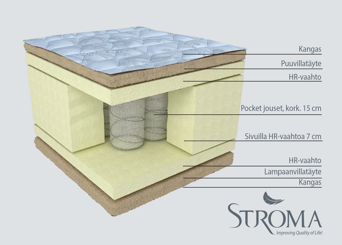 joustinpatja Iris on tarkoitettu mukavaa ja keskipehmeää, laadukasta patjan arvostavalle • patjassa on pocket-tyyppinen jousitus, joka mukautuu kehon mukaisesti, tukee selkää ja paino jakautuu tasaisesti antaen parhaan mahdollisen makuu mukavuudenjoustinpatja Iris on tarkoitettu mukavaa ja keskipehmeää, laadukasta patjan arvostavalle•patjassa on pocket-tyyppinen jousitus, joka mukautuu kehon mukaisesti, tukee selkää ja paino jakautuu tasaisesti antaen parhaan mahdollisen makuu mukavuuden•patja on verhoiltu Sensovel Viskoosikankaalla, antistaattinen, hengittävä, kosteutta pois johtava, korkealaatuinen ja pehmeä pehmeä kangas, kangas on kansainvälisen Öko-Tex 100 -standardin mukainen•päällinen on toiselta puolelta tikattua puuvillaa ja toiselta puolelta tikattua lampaanvillaa•jousen halkaisija 1,80 mm (245 jousta/m²)•jousituksella on 7 vuoden takuu•pakattu jousitus on päällystetty molemmalta puolelta high resilience -vaahtomuovilla, joka takaa miellyttävän mukavuuden•patjan sivuilla vahvistetut kahvat, jotka on valmistettu samasta kankaasta kuin patja•tuote on pakattu polyetyleenipussiin•tilattavissa myös erikoiskokoja, erikoismittaisella patjalla ei ole palautusoikeutta•valmistettu Kyproksella•Miten valita patja?