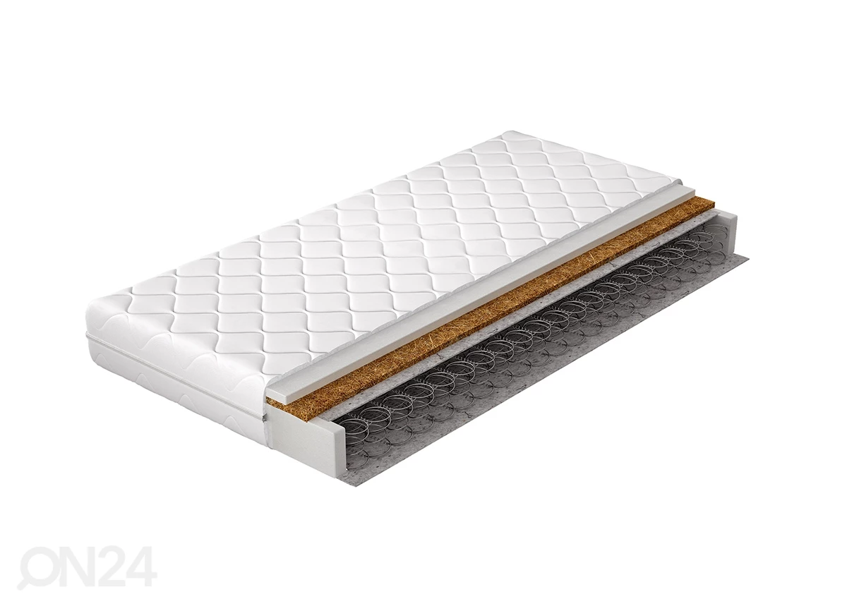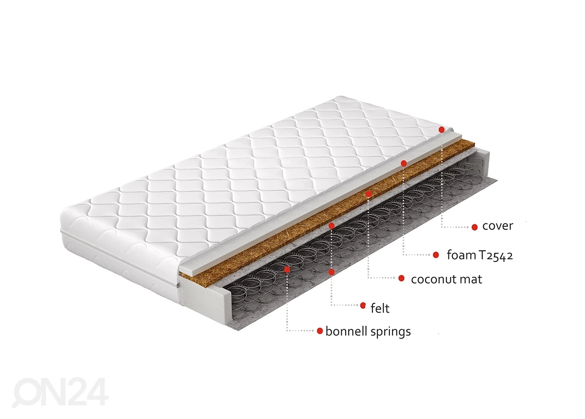 Täytteenä on vaahtomuovi T2542 + kookosmatto + huoma + bonnell-jouset • Päällinen on hypoallerginen • korkeus 14 cm • jäykkyys H4 (kehon painolle 100-120 kg) • Päällisenä on tikattu kangasTäytteenä on vaahtomuovi T2542 + kookosmatto + huoma + bonnell-jouset•Päällinen on hypoallerginen•korkeus 14 cm•jäykkyys H4 (kehon painolle 100-120 kg)•Päällisenä on tikattu kangas•päällinen on vetoketjulla avattava ja pestävissä enintään 40 ºC vedellä•Jousen halkaisija on 2,2 mm, jousien lukumäärä 115 jousta/m²
