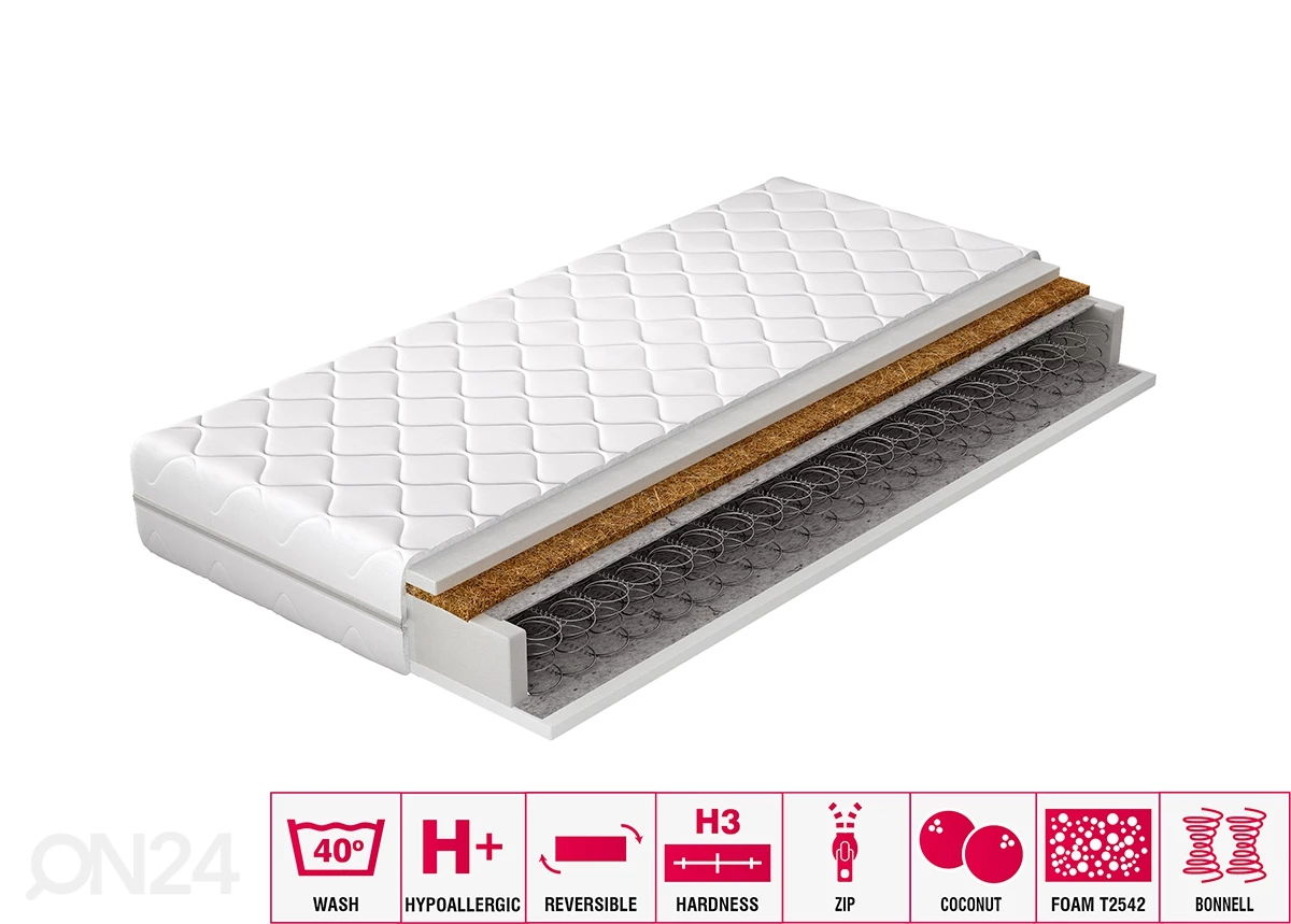 Täytteenä on T2542 vaahomuovi + kookosmatto + huopa + bonnell-jouset • keskipehmeys H3 (kehon paino 60-100 kg) • Kaksipuolinen • Päällisenä on hypoallerginen tikattu kangas • korkeus: 16 cmTäytteenä on T2542 vaahomuovi + kookosmatto + huopa + bonnell-jouset•keskipehmeys H3 (kehon paino 60-100 kg)•Kaksipuolinen•Päällisenä on hypoallerginen tikattu kangas•korkeus: 16 cm•päällinen on vetoketjulla avattava ja pestävissä enintään 40 ºC vedellä•Käyttöajan pidentämiseksi suosittelemme petauspatjan käyttöä•Jousen halkaisija on 2,2 mm, jousien lukumäärä 115 jousta/m²