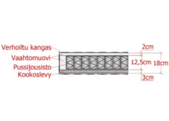 patja soveltuu hyvin selkävaivoista kärsiville • patjassa on 5-kerroksinen pocket-jousitus, jossa kaikki jouset on pakattu erikseen (taskujousitus)patja soveltuu hyvin selkävaivoista kärsiville•patjassa on 5-kerroksinen pocket-jousitus, jossa kaikki jouset on pakattu erikseen (taskujousitus)•patjan yhdellä puolella on 3 cm kookoslateksi, joka on tuotteelle jäykkyyttä, hävittämättä kerrosjousituksen vaikutusta•toisella puolella on laadukasta vaahtomuovia, tiheys 25 kg/m³•jousituksessa käytetyn jousen halkaisija on 2,00 mm, jousien määrä 264 jousta/m²•jousipatja on päällystetty beigellä strech-kankaalla (100gr/m²), joka on tikattu vatiinilla•päällinen on irrotettavissa, hienopesu, ei linkousta•suosittelemme sijauspatjan käyttöä, joka pidentää patjan käyttöikää•tilattavissa myös erikoismitoilla, tiedustele hintaa ja toimitusaikaa (erikoismittaisilla patjoilla ei ole palautusoikeutta)•takuu kaksi vuotta•Miten valita patja?