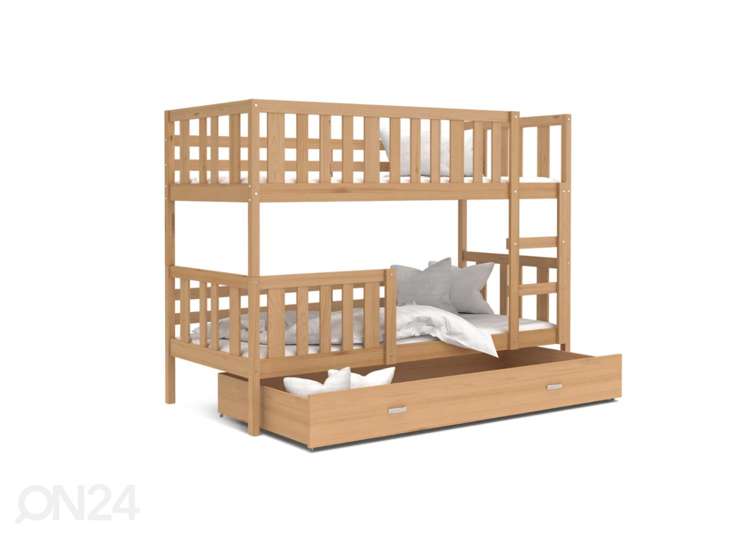 Kerrossänky on valmistettu männystä ja melamiinipinnoitetusta kalustelevystä • toimitukseen sisältyy kerrossänky, sängynpohjat, vuodevaatelaatikko ja kaksi vaahtomuovipatjaa 80x190x7 cm mitoilla • PVC-reunakanttaus • Laatikossa on pienet pyörätKerrossänky on valmistettu männystä ja melamiinipinnoitetusta kalustelevystä•toimitukseen sisältyy kerrossänky, sängynpohjat, vuodevaatelaatikko ja kaksi vaahtomuovipatjaa 80x190x7 cm mitoilla•PVC-reunakanttaus•Laatikossa on pienet pyörät•Vetimet ovat muovia•kasattavissa myös peilikuvana ja käytettävissä kahtena eri sänkynä•Molempien sänkyjen enimmäiskantavuus 70 kg