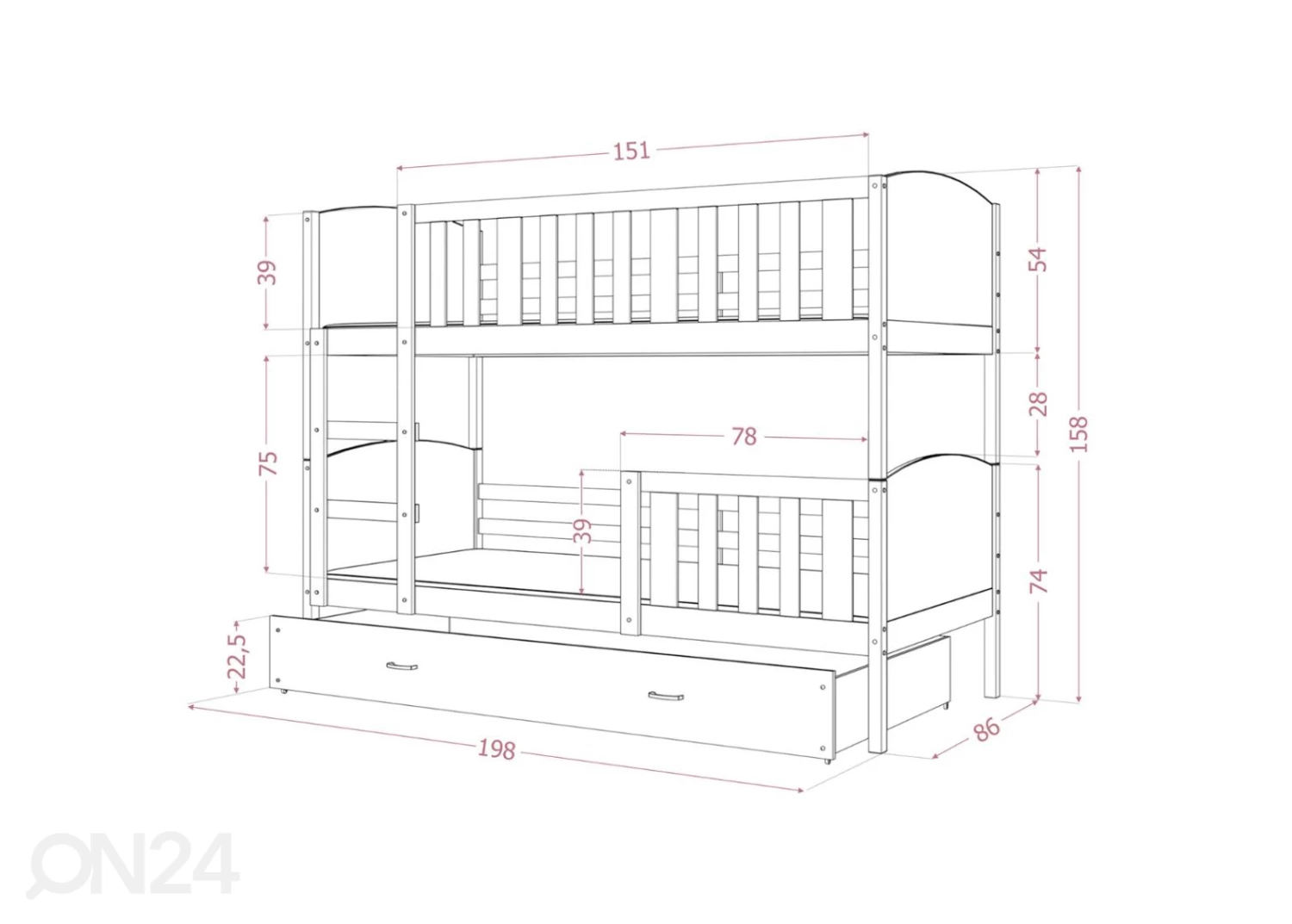 Kerrossänky on valmistettu melamiinipinnoitetusta kalustelevystä • toimitukseen sisältyy kerrossänky, sängynpohjat, vuodevaatelaatikko ja 2 vaahtomuovipatjaa 80x190x7 cm mitoilla • Laatikossa on pienet pyörät • Vetimet ovat muoviaKerrossänky on valmistettu melamiinipinnoitetusta kalustelevystä•toimitukseen sisältyy kerrossänky, sängynpohjat, vuodevaatelaatikko ja 2 vaahtomuovipatjaa 80x190x7 cm mitoilla•Laatikossa on pienet pyörät•Vetimet ovat muovia•kasattavissa peilikuvana ja käytettävissä kahtena eri sänkynä•molemman sängyn kantavuus on enintään 60 kg