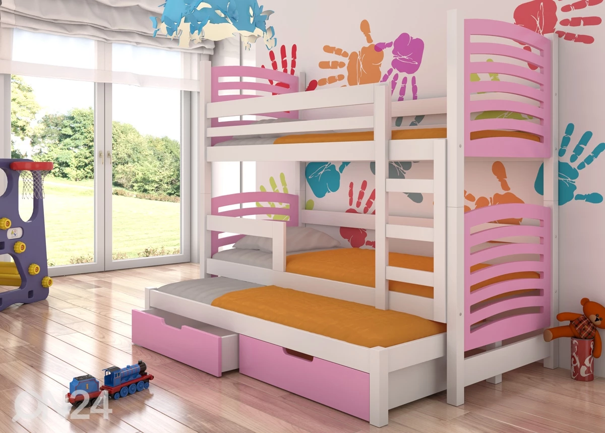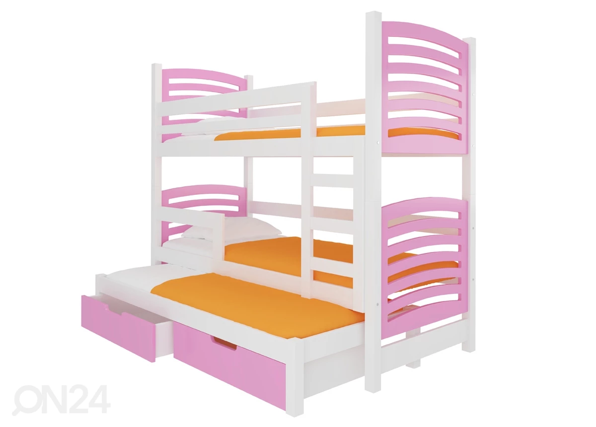 Sängynrunko on valmistettu männystä, päädyt ja vuodevaatelaatikot kalustelevystäSängynrunko on valmistettu männystä, päädyt ja vuodevaatelaatikot kalustelevystä•toimitukseen sisältyy kerrossänky, varasänky, sängynpohjat, kaksi vuodevaatelaatikkoa, kaksi vaahtomuovipatjaa 75x180x6 cm ja yksi vaahtomuovipatja 75x172x6 cm mitoissa•viimeistelty maalilla ja lakalla•vuodevaatelaatikot liukuvat pyörillä•kantavuudet ylemmästä sängystä alkaen: 100 kg, 120 kg ja 80 kg•kerrossänkyä on mahdollista käyttää myös kolmena erillisenä sänkynä sekä kasata peilikuvana•viimeistely: valkoinen/ vaaleanpunainen