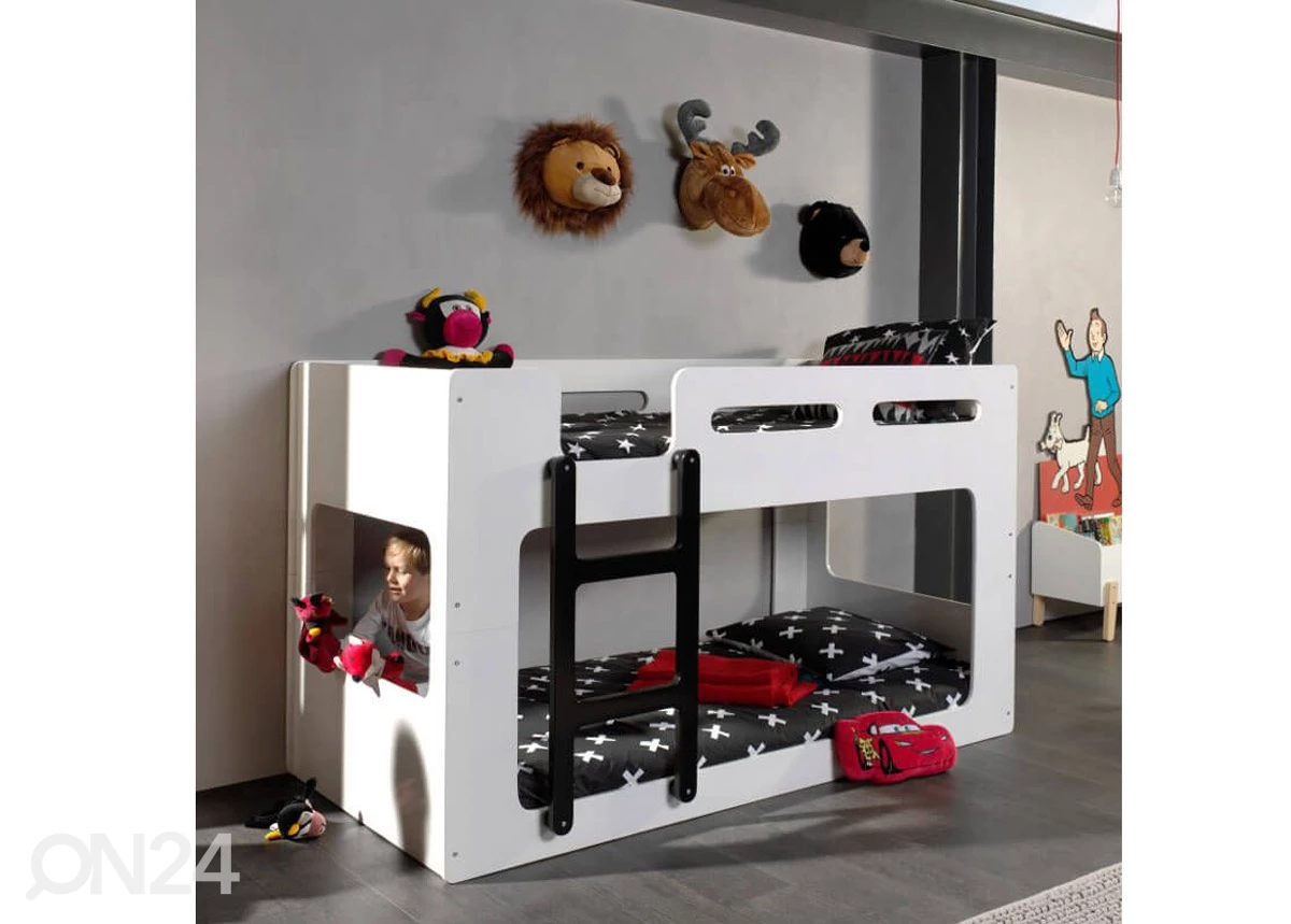 Kerrossänky on valmistettu laadukkaasta valkoiseksi maalatusta MDF-levystä • sängynpohja sisältyy toimitukseen • patjat eivät sisälly toimitukseen, tilaa sänkyihin sopivat patjat mitoissa 90×200 cmKerrossänky on valmistettu laadukkaasta valkoiseksi maalatusta MDF-levystä•sängynpohja sisältyy toimitukseen•patjat eivät sisälly toimitukseen, tilaa sänkyihin sopivat patjat mitoissa 90×200 cm•Sängyn alaosaa on mahdollsita käyttää sänkynä tai leikkialueena•Sänky sopii 6 -vuotiaasta alkaen•kantavuus: 90 kg•väri: valkoinen / musta