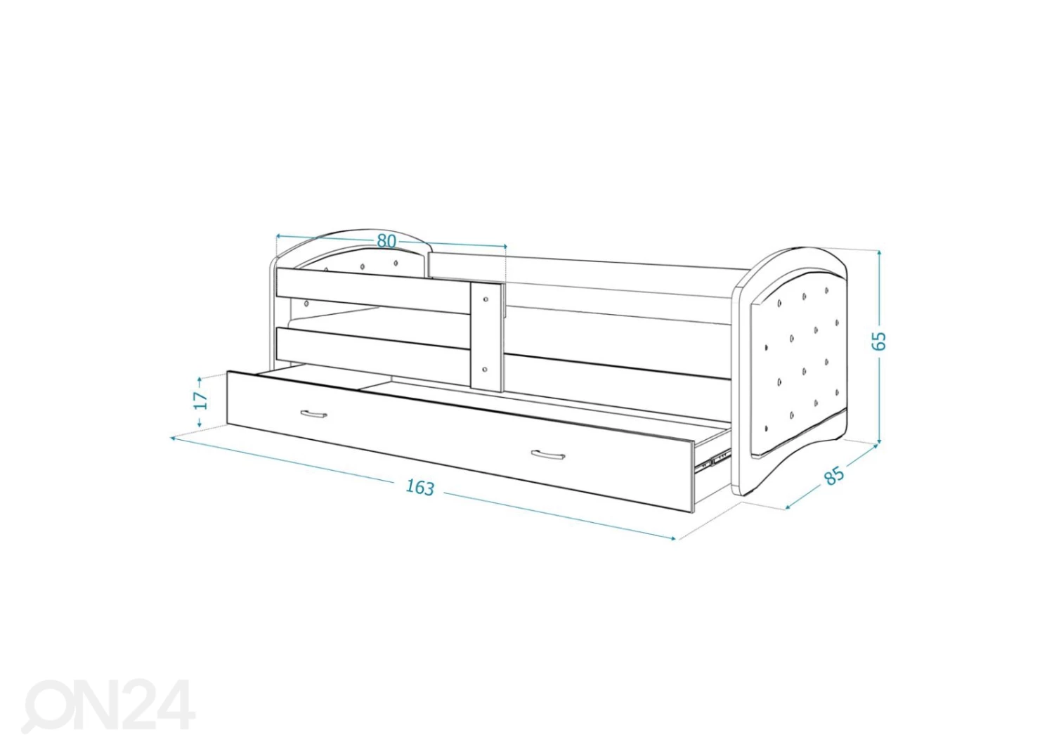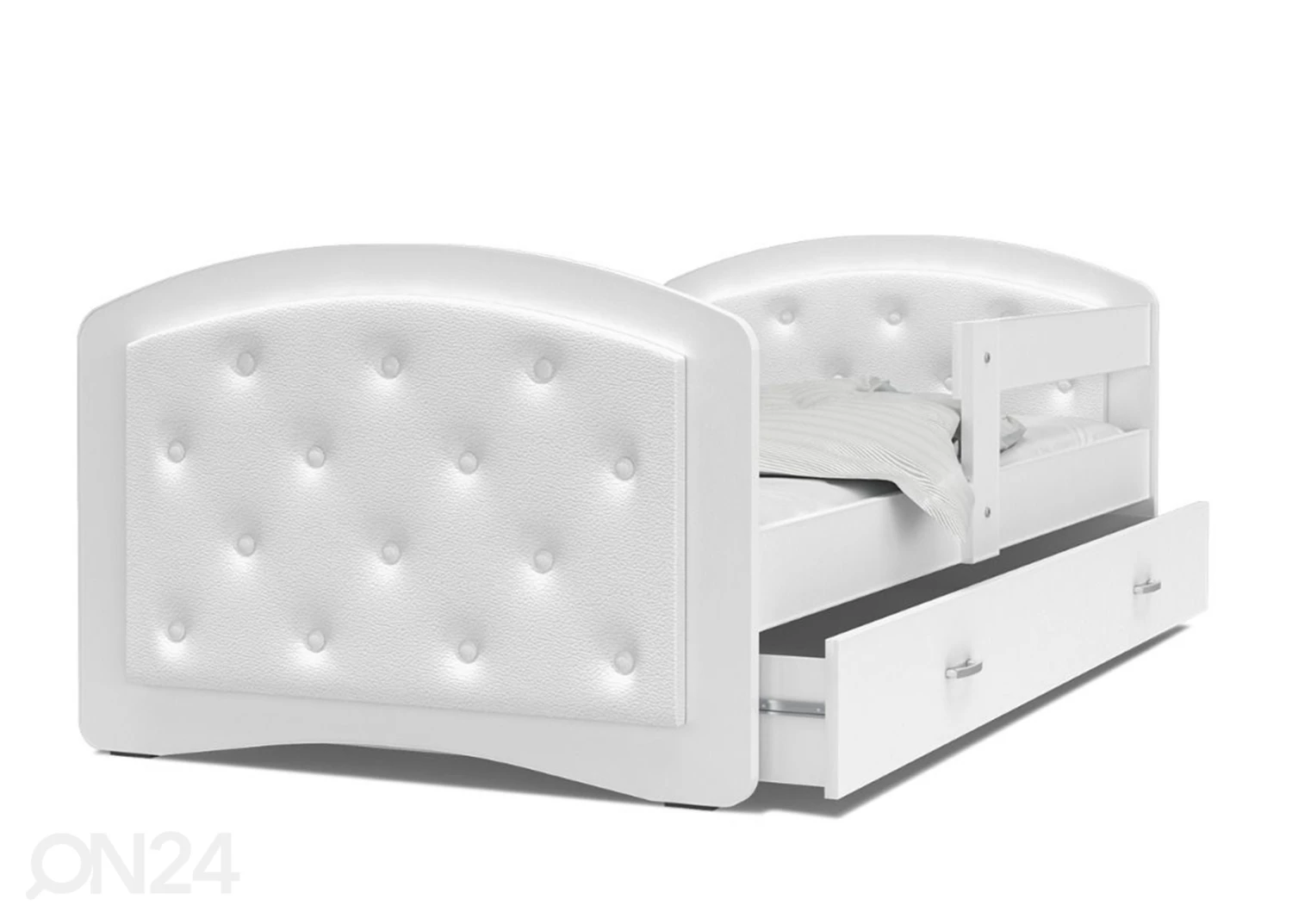 Lastensänky on valmistettu MDF-kalustelevystä • Päädyt on osittain verhoiltu keinonahalla • toimitukseen sisältyy sänky, vuodevaatelaatikko, sängynpohja ja vaahtomuovipatja 80x160x7 cm mitoissa • PVC-reunakanttaus • Laatikossa on metallikiskotLastensänky on valmistettu MDF-kalustelevystä•Päädyt on osittain verhoiltu keinonahalla•toimitukseen sisältyy sänky, vuodevaatelaatikko, sängynpohja ja vaahtomuovipatja 80x160x7 cm mitoissa•PVC-reunakanttaus•Laatikossa on metallikiskot•vetimet ovat muovia•Voidaan koota myös peilikuvana•sängyn kantavuus on enintään 60 kg