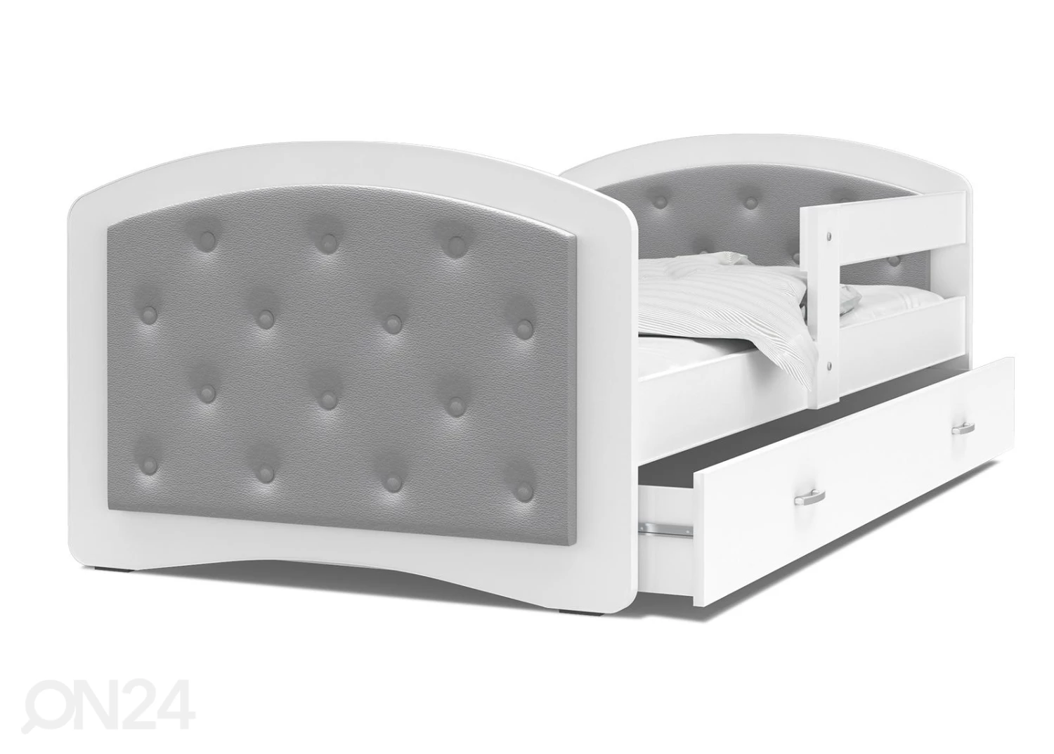 Lastensänky on valmistettu MDF-kalustelevystä • Päädyt ovat osittain verhoiltu napeilla ja keinonahalla • Toimitukseen sisältyy sänky, vuodevaatelaatikko, sängynpohja ja vaahtomuovipatja 80x180x7 cm mitoissa • PVC-reunakanttausLastensänky on valmistettu MDF-kalustelevystä•Päädyt ovat osittain verhoiltu napeilla ja keinonahalla•Toimitukseen sisältyy sänky, vuodevaatelaatikko, sängynpohja ja vaahtomuovipatja 80x180x7 cm mitoissa•PVC-reunakanttaus•Laatikossa on metallikiskot•vetimet ovat muovia•Voidaan koota myös peilikuvana•sängyn kantavuus on enintään 70 kg