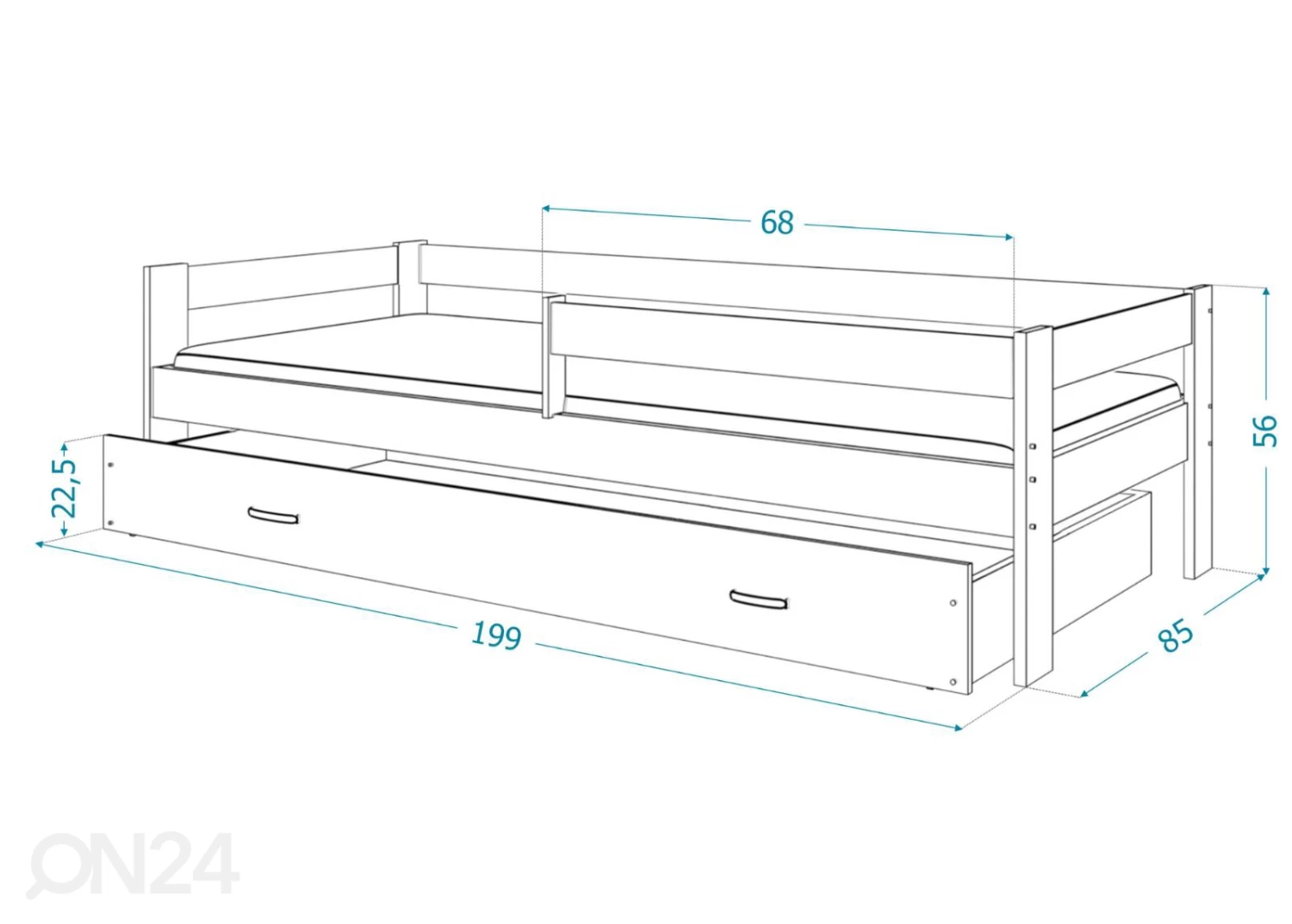 Lastensänky on valmistettu MDF-kalustelevystä • Toimitukseen sisältyy sänky, vuodevaatelaatikko, sängynpohja ja vaahtomuovipatja mitoilla 80x190x7 cm • PVC-reunakanttaus • Laatikossa on metallikiskot • vetimet on muoviaLastensänky on valmistettu MDF-kalustelevystä•Toimitukseen sisältyy sänky, vuodevaatelaatikko, sängynpohja ja vaahtomuovipatja mitoilla 80x190x7 cm•PVC-reunakanttaus•Laatikossa on metallikiskot•vetimet on muovia•kasattavissa myös peilikuvana•kantavuus enintään: 70 kg