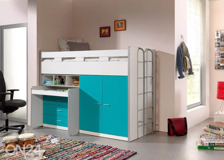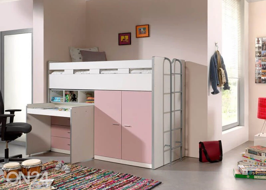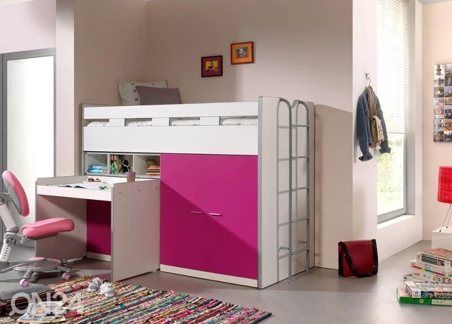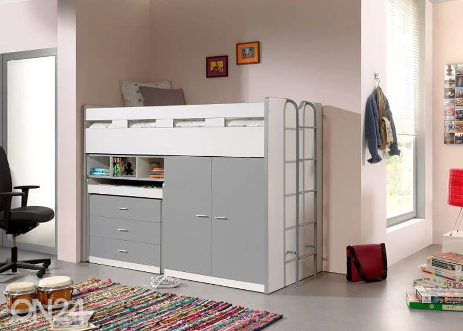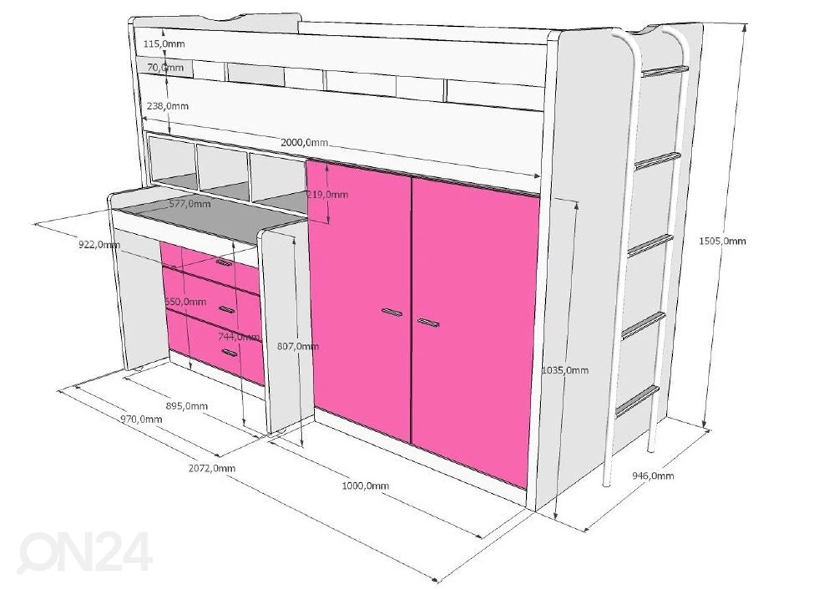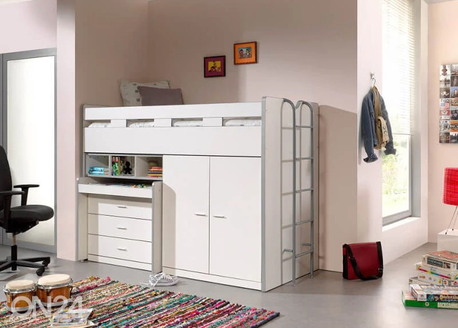 Käytännöllinen parvisänky on valmistettu laadukaasta MDF-kalustelevystä • viimeistelty valkoisella lakkamaalilla • 2-ovinen tilava kaappi, 3 laatikkoa, hylly ja tilaa säästävänä ratkaisua on laatikoiden päällä ulosvedettävä pöytätasoKäytännöllinen parvisänky on valmistettu laadukaasta MDF-kalustelevystä•viimeistelty valkoisella lakkamaalilla•2-ovinen tilava kaappi, 3 laatikkoa, hylly ja tilaa säästävänä ratkaisua on laatikoiden päällä ulosvedettävä pöytätaso•Sängyn yläreuna takaa lapse turvallisenn nukkumisen, tikkaat mukavaan ylöskiipeämiseen•Tikkaiden puoli on valittavissa•Kaapin ovien ja laatikoiden vetimet ovat harmaaksi maalattua metallia•sängynpohja sisältyy toimitukseen•patja ei sisälly toimitukseen, tilaa sopiva patja 90×200 cm mitoissa