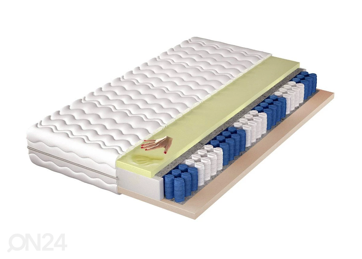 Pocket jousitus • 7-vyöhykepakattu jousijärjestelmä, jossa kaikki jouset on pakattu erillisiin kangaspusseihin • täyte: T25 vaahtomuovi ja viskoosi • antiallerginen • korkeus 20 cm • jäykkyys H3 (kehon painolle 60-100 kg)Pocket jousitus•7-vyöhykepakattu jousijärjestelmä, jossa kaikki jouset on pakattu erillisiin kangaspusseihin•täyte: T25 vaahtomuovi ja viskoosi•antiallerginen•korkeus 20 cm•jäykkyys H3 (kehon painolle 60-100 kg)•patjaa suositellaan käännettäväksi joka 2-3 kuukausi•patjan päällinen on tikattua kangasta (100% polyesteri)•päällinen on vetoketjulla avattava ja pestävissä 60 ºC vedessä