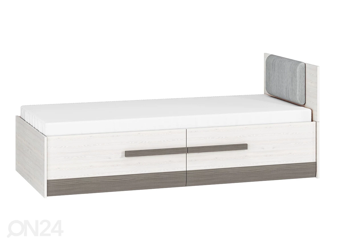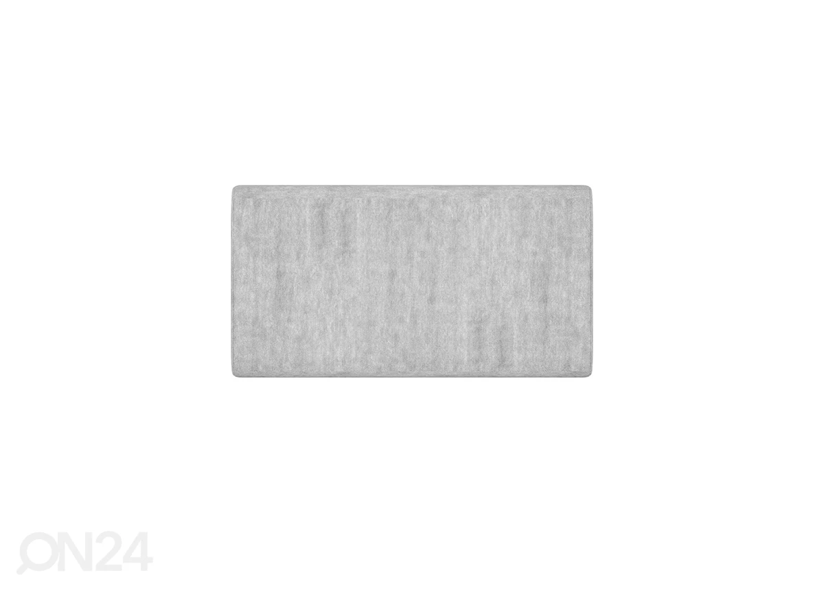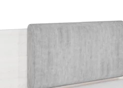 Sängyn päätypehmuste on verhoiltu harmaalla kankaallaSängyn päätypehmuste on verhoiltu harmaalla kankaalla