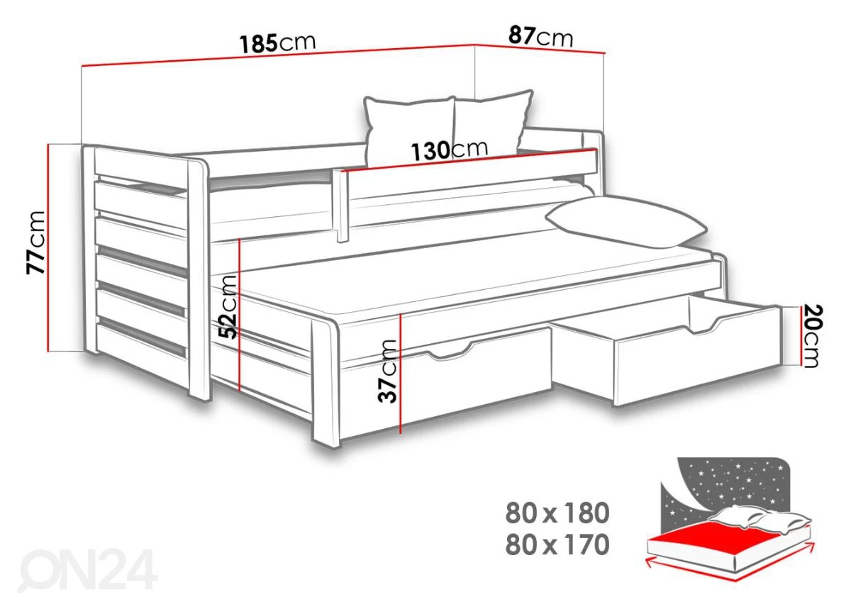 Valmistettu männystä ja 18mm laminoidusta kalustelevystä • Mäntypuiset sälepohjat sisältyvät toimitukseen • Vuodevaatelaatikot • Viimeistelty akryylimaaleilla • Viimeistely: mäntyValmistettu männystä ja 18mm laminoidusta kalustelevystä•Mäntypuiset sälepohjat sisältyvät toimitukseen•Vuodevaatelaatikot•Viimeistelty akryylimaaleilla•Viimeistely: mänty•Patjat ei sisälly toimitukseen, tilaa sopivat patjat mitoilla 80×180 cm ja 80×170 cm•Alemman patjan paksuus enintään 10 cm