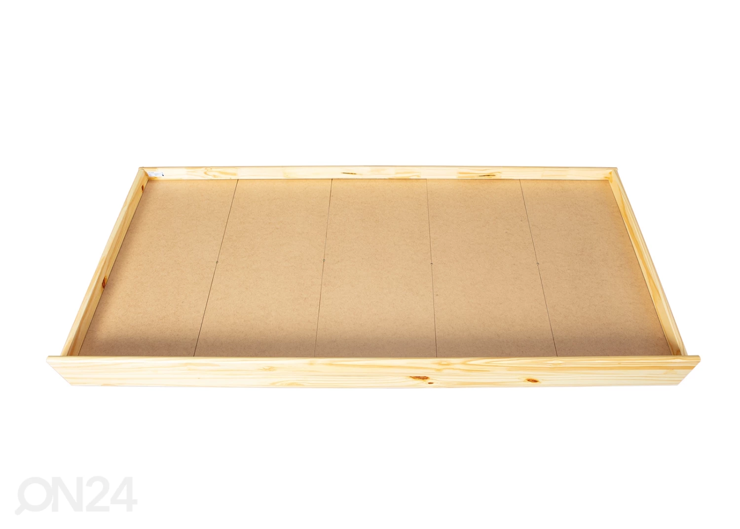Männystä valmistettu vuodevaatelaatikko • viimeistely: luonnollinen lakka • Laatikon pohja on MDF-kalustelevyä • Laatikossa on pyörätMännystä valmistettu vuodevaatelaatikko•viimeistely: luonnollinen lakka•Laatikon pohja on MDF-kalustelevyä•Laatikossa on pyörät